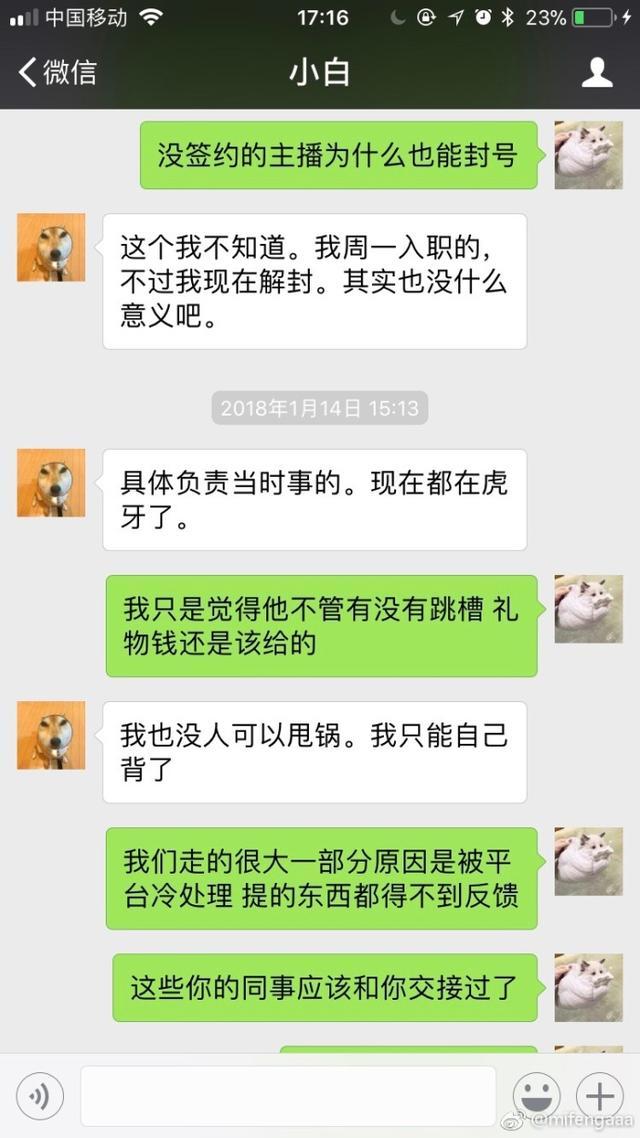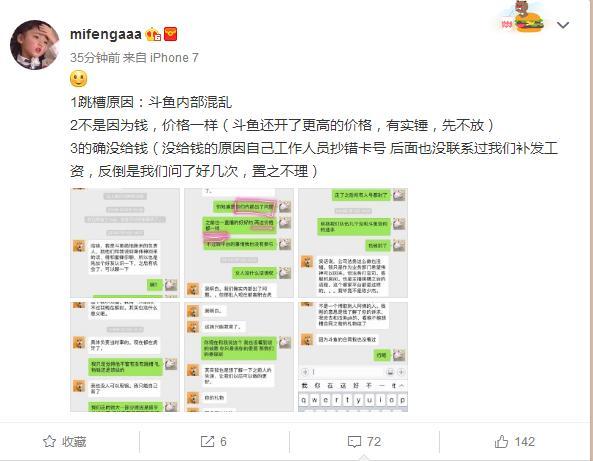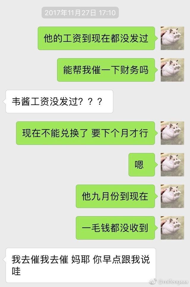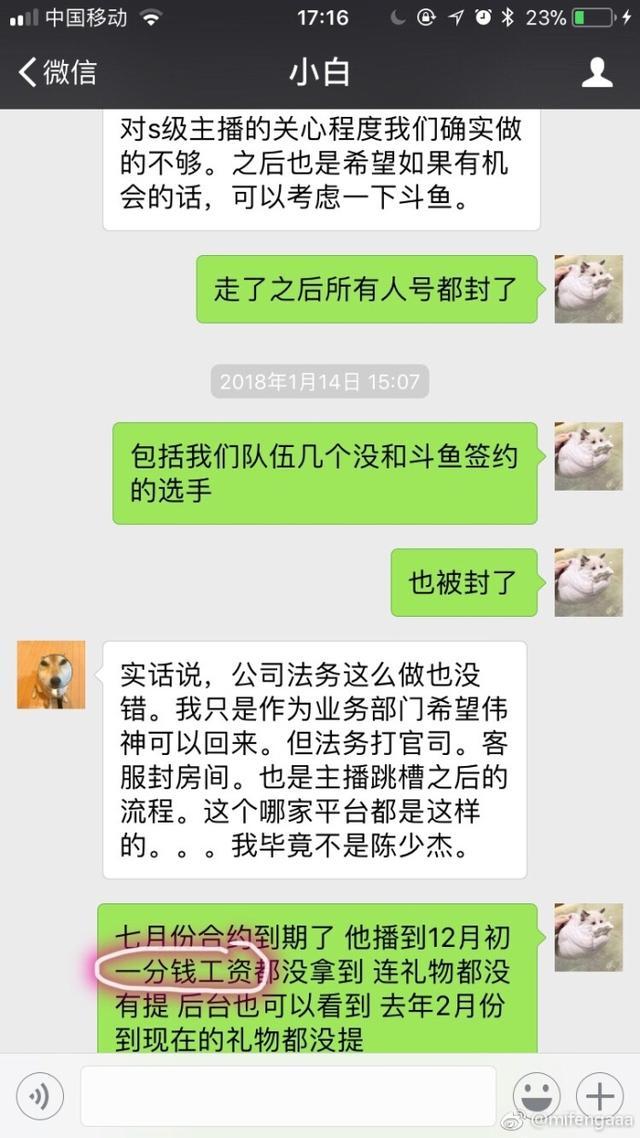 作為已經(jīng)跳槽虎牙一段時間的韋神,在前段時間曾經(jīng)在微博上聲援蛇哥討薪,在蛇哥diss斗魚欠薪的時候,韋神也發(fā)博表示自己的工資也沒給。而且不是小數(shù)目。其實關(guān)于韋神和斗魚的欠薪問題,在之前韋神的女友就曾經(jīng)diss過斗魚,最終原因是斗魚方面弄錯了韋神的工資卡號。而在今天,韋神女友在微博曬出1月份和斗魚絕地負責人的聊天記錄。