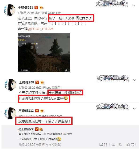 可以看到在6號晚上老王連發(fā)了3條微博吐槽游戲外掛,短短兩個小時內(nèi),他就遇到了“隔山頭機瞄殺人”、“子彈連發(fā)無后座AK”和“噴子子彈追蹤”等各種新式外掛,直接讓他心態(tài)崩盤,尤其是在被噴子子彈追蹤殺死的時候,老王就跟瘋了一樣狂喊:“有種你子彈跟出屏幕啊,有種你就跟出來啊!”