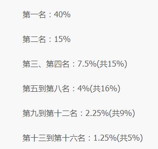 隨著獎金池的不斷擴增,戰(zhàn)隊能夠按獎金池的一定比例獲得獎金,而不再是固定數(shù)額。獎金將會按照以下的比例在隊伍之間進行分配: