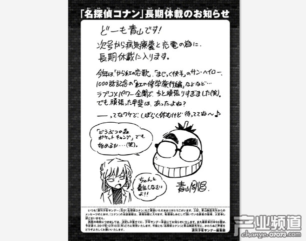 《名偵探柯南》在今年也取得了不錯的成績,于4月在日本上映的第21部劇場版《名偵探柯南:唐紅的戀歌》刷新了系列劇場版票房最高紀(jì)錄,而漫畫也連載超過了第1000回。昨日下午官方宣布,青山剛昌為了治療疾病和充電,《名偵探柯南》將長期休刊。