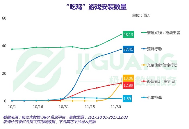 在幾款新上線(xiàn)的“吃雞”手游作品中,網(wǎng)易旗下的《荒野行動(dòng)》在安裝量上占據(jù)絕對(duì)優(yōu)勢(shì)。這款游戲上線(xiàn)后便迎來(lái)了安裝量的增長(zhǎng)爆發(fā)期,盡管其增速在11月中旬開(kāi)始放緩,但仍然維持著上升趨勢(shì)。截至12月3日,《荒野行動(dòng)》的安裝數(shù)量達(dá)到3,741萬(wàn),大幅領(lǐng)先于另外3款新上線(xiàn)游戲。