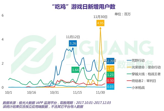 極光大數(shù)據(jù)的監(jiān)測(cè)結(jié)果顯示,《荒野行動(dòng)》的日活躍用戶(hù)數(shù)升幅非常顯著,在絕對(duì)值上也領(lǐng)先于另外幾款同類(lèi)產(chǎn)品。