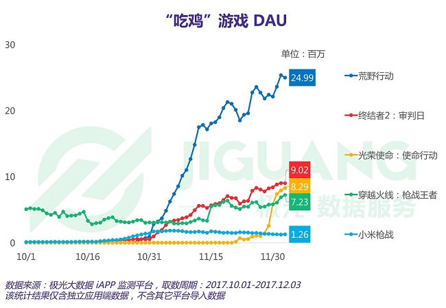 在12月3日當(dāng)天,《荒野行動(dòng)》的日活躍用戶(hù)數(shù)達(dá)到2,499萬(wàn)。在幾款主流“吃雞”手游中,《荒野行動(dòng)》是唯一一款日活躍用戶(hù)達(dá)到千萬(wàn)級(jí)別的產(chǎn)品。排名第二的則是其同門(mén)產(chǎn)品《終結(jié)者2:審判日》,同一天的日活躍用戶(hù)數(shù)為902萬(wàn)。
