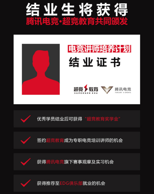 在這些培養(yǎng)計(jì)劃順利結(jié)業(yè)的學(xué)員將獲得騰訊電競(jìng)和超競(jìng)教育頒發(fā)的雙證書,含金量非常高,得到行業(yè)權(quán)威機(jī)構(gòu)認(rèn)可,大幅提高了學(xué)員的就業(yè)率。而且優(yōu)秀的學(xué)員更是有機(jī)會(huì)被推薦到騰訊、EDG、超競(jìng)教育等眾多名企,可以說這也是一個(gè)圓你電競(jìng)夢(mèng)的捷徑。超競(jìng)教育將效仿當(dāng)年黃埔軍校搭建超競(jìng)教育校友社區(qū),邀請(qǐng)若風(fēng)、Remember等大咖入駐分享交流,必將成為國(guó)內(nèi)最大的電競(jìng)?cè)瞬沤涣髌脚_(tái)。