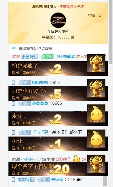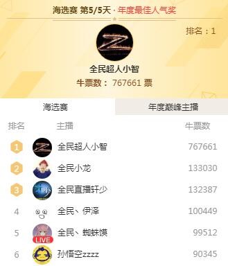 眾所周知,小智曾經(jīng)因為腰傷整整休息了幾個月,傷愈歸來后的他基本都是在養(yǎng)生直播,很少有通宵連播的情況了。最近全民直播搞了一個年度盛典,得票最多的主播會獲得年度最佳人氣主播的殊榮,按以往小智的脾氣,對于這樣一個獎項肯定不會那么在乎的,畢竟連LOL最佳主播都拿了。出人意料的是,這一次的小智卻相當認真,甚至罕見地通宵直播起了游戲,如此勤奮的小智自然獲得了眾多粉絲的支持,得票數(shù)完全碾壓全平臺,穩(wěn)居排行榜首。