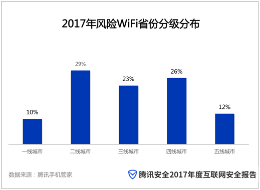《報(bào)告》同時(shí)顯示,隨著一線城市的公共WiFi增長空間趨于飽和,公共WiFi建設(shè)逐漸開始向二、三、四線城市滲透。據(jù)騰訊手機(jī)管家針對(duì)風(fēng)險(xiǎn)WiFi城市分布占比的調(diào)查數(shù)據(jù)顯示,一線城市風(fēng)險(xiǎn)WiFi占比為10%,而二線、三線、四線城市占比分別達(dá)到29%、23%、26%,WiFi使用風(fēng)險(xiǎn)遠(yuǎn)超一線城市。