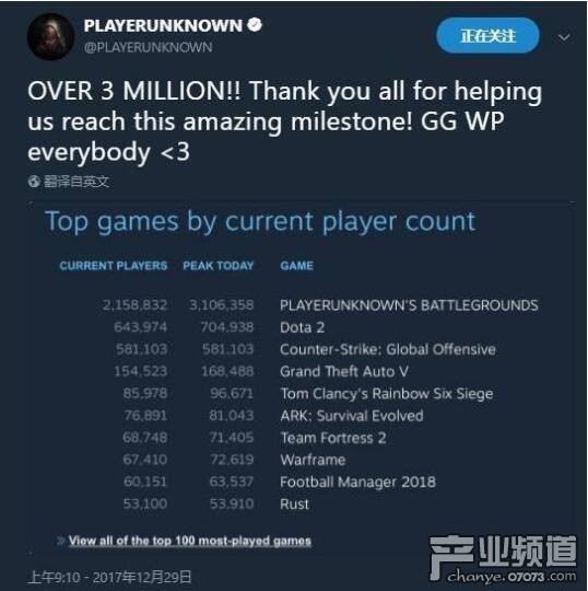 絕地求生在過去的不到一年內(nèi)已經(jīng)成功的成為了目前最受歡迎的PC游戲之一,并且瘋狂的打破了各項記錄,在一個月前他的銷量就達(dá)到了2800萬超過我的世界成為史上最暢銷的PC游戲,而他的最高同時在線人數(shù)也在元旦期間成功突破了300萬,到現(xiàn)在最高峰值已經(jīng)是323萬了!