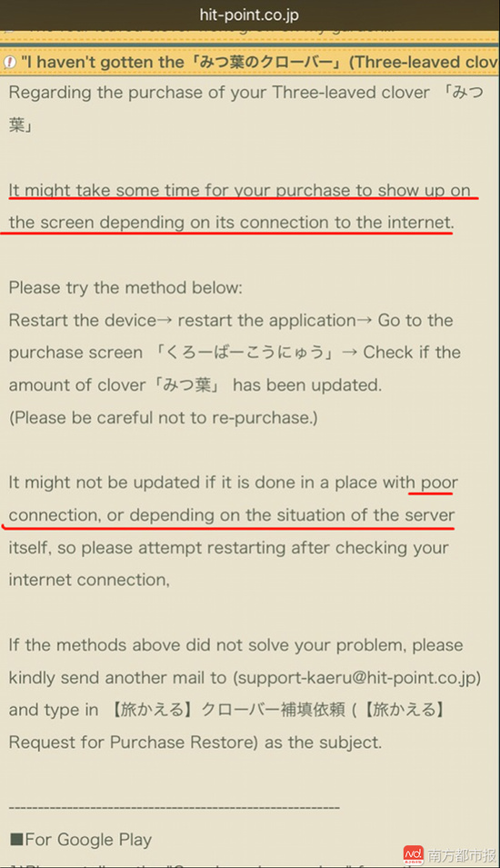 南都記者查詢游戲開發(fā)商hit-point的官網(wǎng)發(fā)現(xiàn),官方證實了“網(wǎng)絡(luò)情況影響充值到賬”一說。在回應(yīng)“三葉草充值不到賬”的答復(fù)中,官方表示:“It might not be d if it is done in a place with poor connection, or depending on the situation of the server itself.”(如果在網(wǎng)絡(luò)環(huán)境很差的環(huán)境下,三葉草數(shù)量可能更新失敗。)