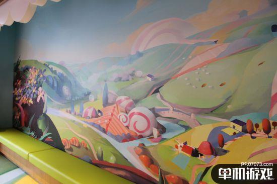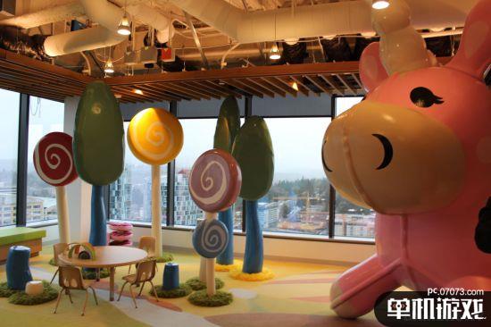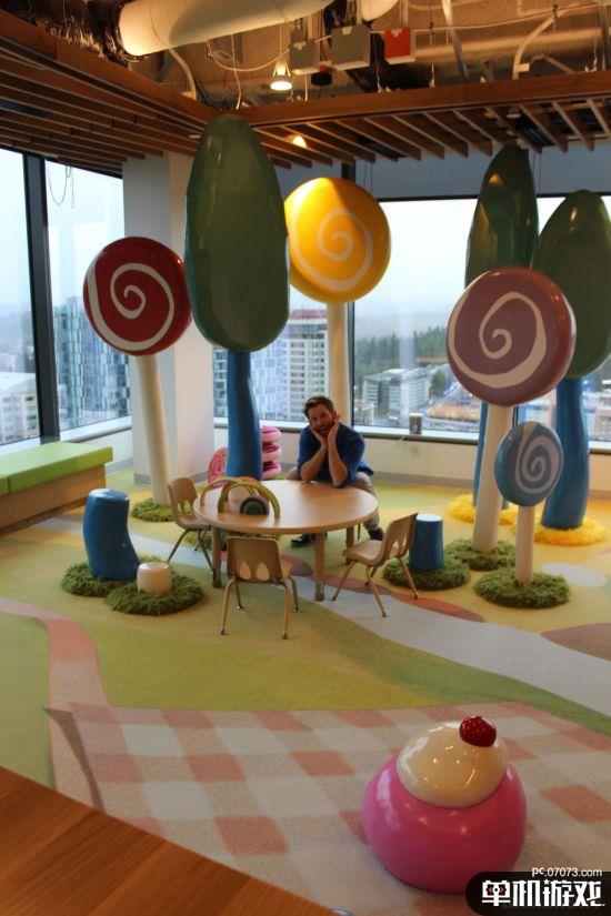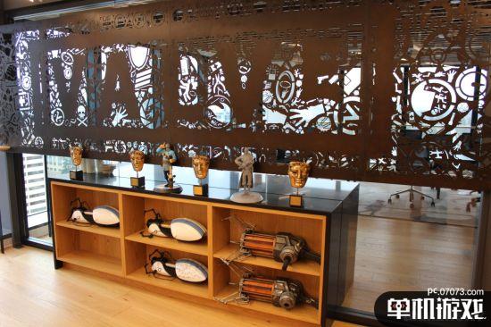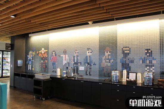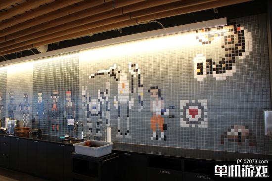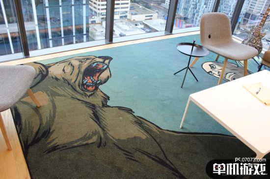 首先,V社新辦公環(huán)境中有一大部分空間用來擺放與游戲有關(guān)的藝術(shù)品,除了我們熟悉的《半條命》、《軍團要塞》和《Dota 2》的主題繪畫和雕塑之外,還摻雜了一些奇怪的東西,比如公司自助餐廳中有一張可愛的平鋪壁畫,還有地毯上的一只兇猛大熊。