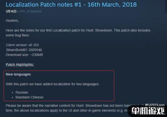 根據(jù)官方在Steam社區(qū)發(fā)布的公告,目前游戲已經(jīng)加入了簡(jiǎn)體中文與俄語(yǔ),不過(guò)《獵殺:對(duì)決》中的劇情內(nèi)容并未進(jìn)行翻譯,本次更新的本地化內(nèi)容僅針對(duì)游戲中的UI和其他游戲內(nèi)元素(例如菜單)。