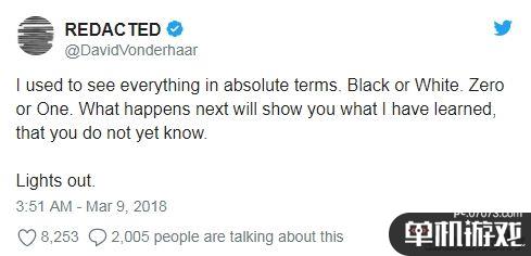 David Vonderhaar的推特賬號非常有個性,在之前COD15正式公布時,他就將推特內(nèi)容、資料和關(guān)注全部刪掉了。如今他又發(fā)了如此一條耐人尋味的訊息,雖然但從字語上來看它描述的內(nèi)容非?!盎逎幇怠?,暗示著一種混亂的世界,與“黑色行動”的主題似乎有某種關(guān)聯(lián)。