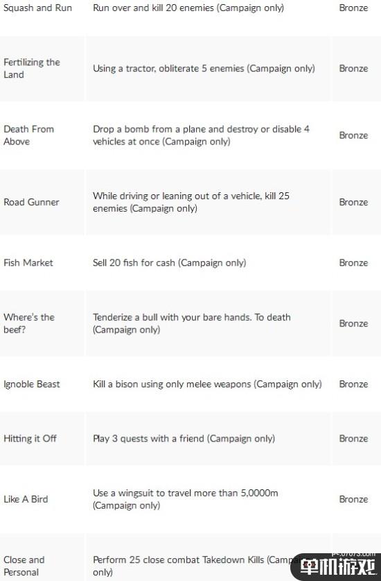 根據(jù)下面的獎杯列表,《孤島驚魂5》中共有51個獎杯(1白金、2金、10銀和38銅)。仔細檢查列表后會發(fā)現(xiàn),其中有10個獎杯實際上是隱藏起來的,玩家必須玩戰(zhàn)役模式中完成特定的任務(wù),才能解鎖這些獎杯。