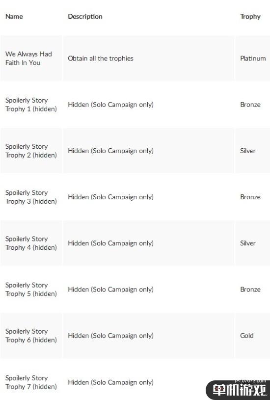 玩家能夠從隱藏獎杯之外的41個獎杯中推斷出游戲并不需要100%完成游戲就能夠獲得所有的獎杯,包括白金獎杯,只要你愿意投入時間和精力就有可能完成。你需要探索游戲世界,在游戲的過程中花費一些錢(應(yīng)該是指游戲內(nèi)的金幣),同時需要花些時間在多人模式當(dāng)中。