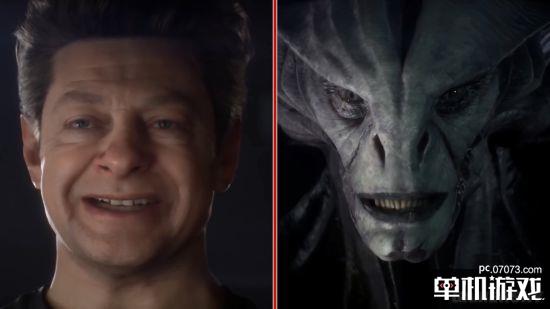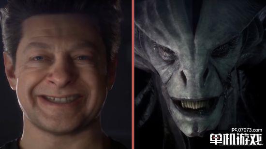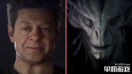 第一段演示是安迪·瑟金斯的表演,視頻左邊是對他本人的面部捕捉和動作展示,右邊則是在他的面部基礎(chǔ)上更進一步放在虛擬非人類角色身上的表演。演示Demo全程采用虛幻引擎實機渲染,包含了建模、動捕、材質(zhì)重建德瑪和技術(shù),效果十分強大。