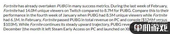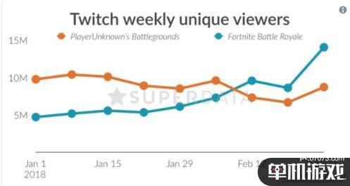據(jù)數(shù)據(jù)調(diào)查機(jī)構(gòu)SuperData報(bào)道,《堡壘之夜》在今年2月的收入以及Twitch觀眾數(shù)量全面趕超《絕地求生》。