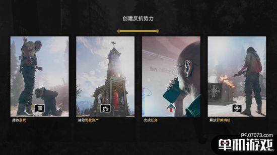 游戲中玩家可以創(chuàng)建反抗勢力,有四種方法,第一種,玩家可以解救那些被異教抓走的人質(zhì),說不定在你幫助他們之后會愿意跟你并肩作戰(zhàn);第二種,可以摧毀那些伊甸之門的資產(chǎn);第三種,可以去完成一些反抗勢力的任務(wù);第四種,玩家可以進(jìn)攻那些哨點(diǎn),攻下這些地方可以幫反抗勢力打下基礎(chǔ),以利于向伊甸之門反攻。