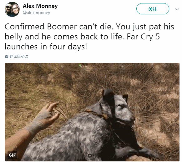 估計也是因為和“愛主心切”的玩家們深有共鳴,B社非常善解人意地就把《輻射4》中的狗肉設(shè)計成了不死的狗狗;而同樣是“愛狗人士”的育碧也為《孤島驚魂5》的狗寶寶“Boomer”加上了這一重保護(hù)。今天育碧公司的公關(guān)人員 Alex Monney就在推特上表示:確認(rèn)啦,狗狗Boomer是死不了的。你只要拍拍它的肚皮,Boomer就能活過來啦。