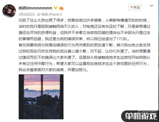 首先我要給因為我曾經(jīng)錯誤的行為而傷害到的朋友道個歉,其次我也給之前支持過我和現(xiàn)在仍然支持我的觀眾真心道個歉,對不起,讓你們失望了。當(dāng)時想要通過捷徑而犯下的錯誤讓大家失望了。但是自從我接觸絕地求生這游戲開始我就從未有過任何作弊行為,希望大家可以監(jiān)督我在絕地求生這個游戲里的任何行為,我也會直面面對大家的指責(zé),并更加努力。