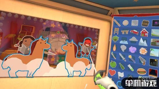 進(jìn)入游戲后,VR玩家會身處在一個只有自己才能看得到的虛擬世界中,看起來像是古代皮影戲的后臺。玩家需要使用一對VR體感手柄從面前豐富的人物剪紙中挑選出自己想要的,組合成人物和物體,按照一定的劇情和邏輯演繹角色和故事,展示給非VR玩家,而展示的目的是讓現(xiàn)實(shí)世界的玩家猜出特定的詞語,比如說如果你想讓其他玩家猜“派對(Party)”這個詞,你也許需要用許多人物的木偶一起跳舞來給出暗示。