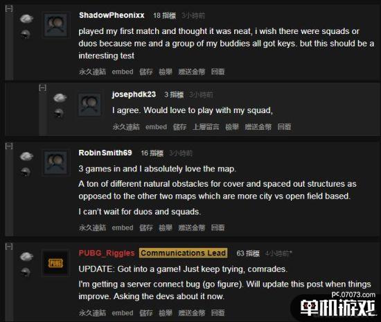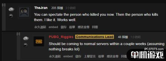 同時(shí)在論壇上,也有不少玩家在體驗(yàn)過之后給出了反饋信息。首先在這次測(cè)試中玩家可以看到殺死自己的人,并且也能看到殺死他們的人,效果不錯(cuò)。不少玩家都表示很喜歡這個(gè)功能,即可以在自己死亡之后盯住一個(gè)玩家觀戰(zhàn)。自己就喜歡看看群毆的時(shí)候最后“鹿死誰手”。而官方人員也在論壇中回復(fù)稱,很高興你們喜歡這個(gè)功能,大概會(huì)在普通服務(wù)器上線的。