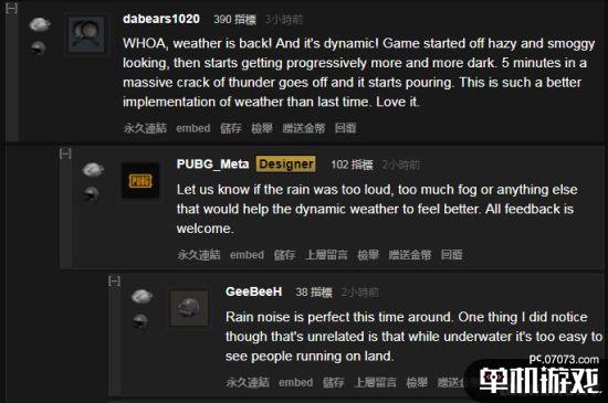 另外,也有玩家對(duì)于動(dòng)態(tài)天氣的回歸表示非常欣慰。他進(jìn)場(chǎng)時(shí)是朦朦朧朧的霧氣,然后越來越暗,大概5分鐘左右開始電閃雷鳴,之后傾盆大雨。感覺天氣效果比之前要好得多,大愛。游戲設(shè)計(jì)師表示,可以反饋是不是覺得雨太大、太吵等等。另外幾位玩家表示,雨聲剛剛好,只不過似乎濕了的路面有點(diǎn)太閃,地面看起來像塑料了。