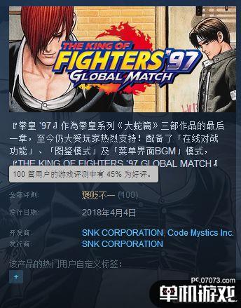 高清冷飯《拳皇97:全球?qū)Q(THE KING OF FIGHTERS '97 GLOBAL MATCH)》于昨日上架了Steam開售,情懷滿分的該作在Steam上的玩家評(píng)價(jià)卻一般,只有45%,褒貶不一水準(zhǔn)。