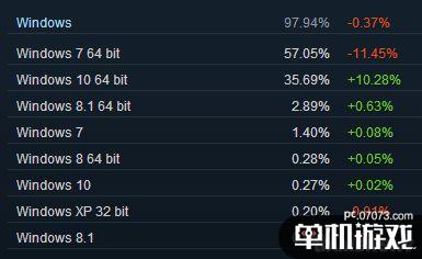 使用Windows 7 64 bit的Steam用戶較上個月下滑了11.45%,跌至57.05%,Windows 10 64位系統(tǒng)使用占比大幅上揚,增加了10.28%,達到了35.69%,按照這個趨勢,等到四月用戶數(shù)據(jù)出爐時,或許二者的差距會進一步縮小,甚至Windows 10再次反超。