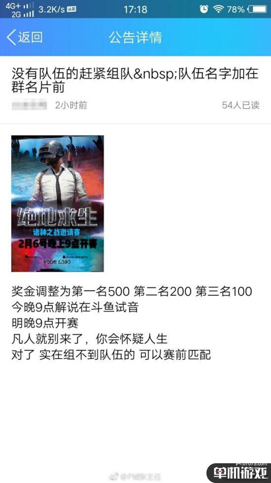 這場(chǎng)“諸神之戰(zhàn)”,先是有人在網(wǎng)上曬出了神仙群的公告,一場(chǎng)《絕地求生》“諸神之戰(zhàn)邀請(qǐng)賽”要于2月6日在斗魚舉辦,獎(jiǎng)金第一名500,還勸阻凡人誤進(jìn),否則會(huì)懷疑人生。