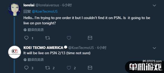 有玩家留言表示想預(yù)購《真三國無雙8》,但在PSN上沒有找到商品頁面,官方回應(yīng)道,《真三國無雙8》將于在2月13日(北京時間14日)上線,但時間不確定。
