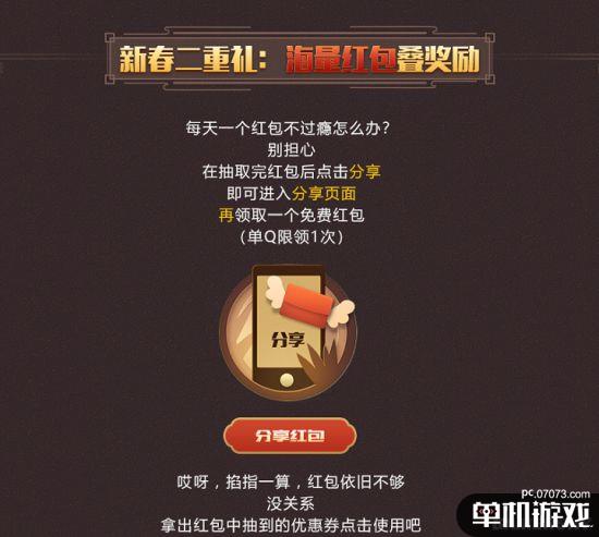 一個紅包不夠用?沒有關系,通過分享紅包的方式能夠額外獲取到紅包。玩家只要在抽完紅包后,點擊分享進入頁面,通過手機端將活動分享給自己的好友或朋友圈,完成分享后就能再獲取一枚紅包(單Q限領一次)。值得一提的是,使用優(yōu)惠券或直接在商城中購買游戲,也能夠增加抽取紅包的次數(shù)。如此強大力度的活動,讓玩家們可以歡樂得度過一個游戲年!