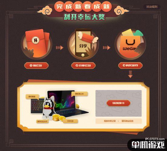 玩家們只要完成前置三個任務,分別是領取紅包,分享紅包,購買游戲且游戲時長>2小時,就能獲得一張抽實物大獎的刮刮卡(單Q限領一張)。有機會獲得海量Q幣、狗年公仔以及終極大獎雷蛇筆記本、雷蛇外設等。