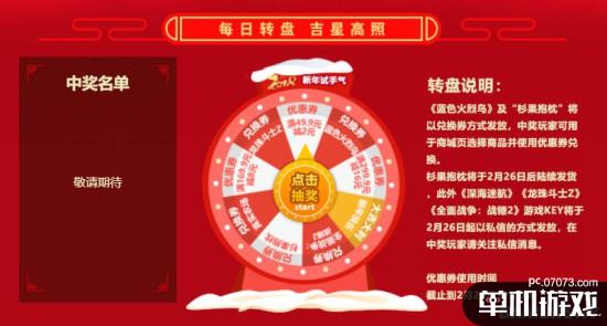 限時(shí)折扣與福袋再便宜超值畢竟需要花錢,杉果春節(jié)特惠中的抽獎(jiǎng)則完全免費(fèi)。玩家每日登陸杉果賬號(hào)都可獲得抽獎(jiǎng)機(jī)會(huì),獎(jiǎng)池中包含《龍珠:斗士Z》、《全面戰(zhàn)爭(zhēng):戰(zhàn)錘2》等大作激活碼,以及杉果定制抱枕等限量周邊,同時(shí)還有不少不同面額的優(yōu)惠券可以領(lǐng)取,買游戲前抽一發(fā)說不定就有更多優(yōu)惠。