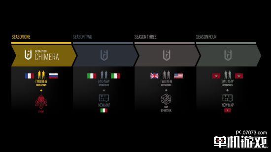 此外,官方也公布了《彩虹六號:圍攻》第三年的計劃,除了第一季度公布的“奇美拉行動”之外,第二季度將會包含兩名意大利干員和一張全新的地圖,第三季度將會公布一名美國干員和一名英國干員,以及一張重做的地圖,第四季度會公布兩名摩洛哥干員,以及一張非洲地圖。