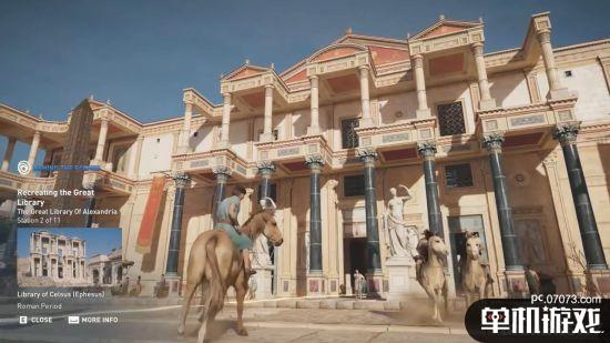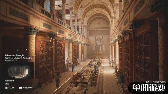視頻中主要展示的是亞歷山大圖書館的旅程。這趟旅程中可以看到圖書館大廳里擺滿了桌子的地方,在那里,學(xué)者們?cè)谘芯课谋?,墻壁上擺滿了卷軸,而這些在公元前48年亞歷山大圍城期間被凱撒軍隊(duì)的大火毀滅。甚至可以看到一些歷史上的著名學(xué)者正將他們的理論和方程式解釋給周圍的圍觀群眾,細(xì)節(jié)非常豐富。