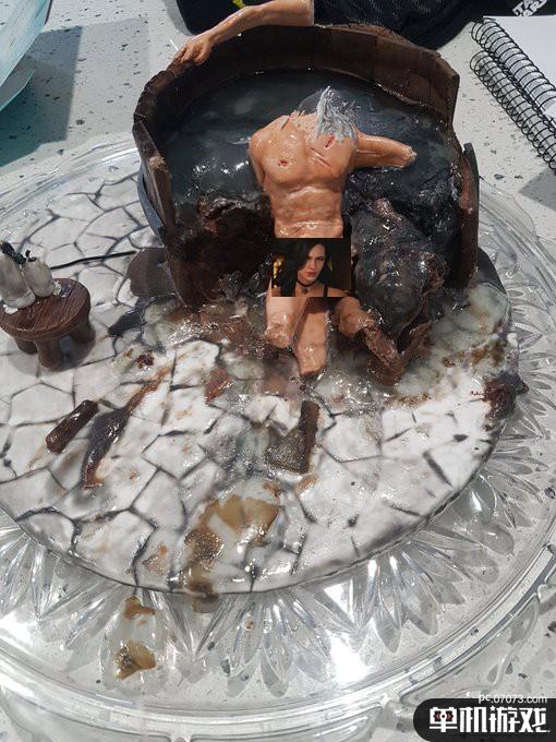 而玩家Klutar在前兩天過生日,他妻子給他做了一款蛋糕,造型也是白狼洗澡的場景。而且“民間出品”,沒那么多顧慮,所以尺度更大。