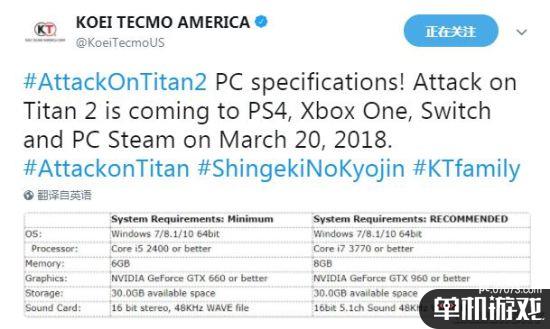 光榮特庫(kù)摩官方推特今天公布了PC版《進(jìn)擊的巨人2》官方配置要求,本作推薦配置也只需GTX 960顯卡,還是相當(dāng)親民的,一起來(lái)了解一下。