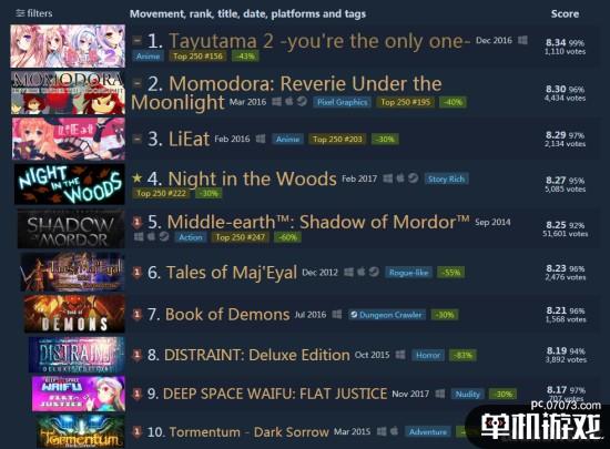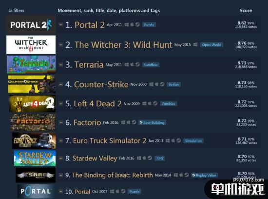 主榜單是全時間段的游戲排名,目前排名前三位分別是《傳送門2》《巫師3》和《泰拉瑞亞》。