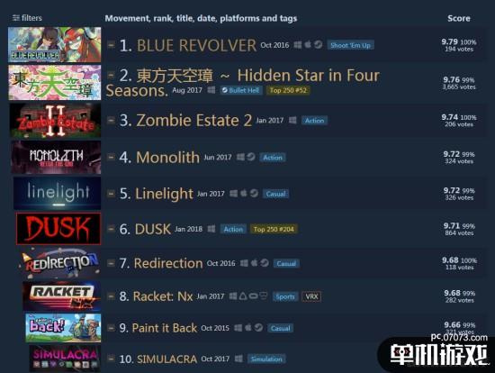 網(wǎng)站還有專門的“隱藏的寶石(hidden gems)”這個分類,適合喜歡小眾游戲的玩家。其中都是玩家數(shù)量不是很多的游戲,一些甚至只有幾十個評測的游戲也出現(xiàn)在了榜單上。目前排名前三的分別是《藍(lán)色左輪(BLUE REVOLVER)》《東方天空璋》和《Zombie Estate 2》。