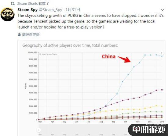在1月底的時候,Steam Charts在官方推特賬號上曾經(jīng)轉(zhuǎn)推了Steam Spy的一條推文,該推文表示《絕地求生》中國玩家的瘋漲似乎停止,并推測此次的人數(shù)增長停止或許和騰訊代理《絕地求生》的國服有關(guān),所以玩家正在等待國服或在等待能夠免費(fèi)玩的版本。