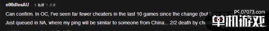 不少外國(guó)玩家也在帖子中進(jìn)行了回復(fù),有的玩家表示在大洋洲服務(wù)器(OC),在官方改動(dòng)后的最近10場(chǎng)比賽中,外掛的確見(jiàn)得少了,不過(guò)還是有,但在NA,因?yàn)樽约簆ing值和中國(guó)玩家接近,還是遇到了2次作弊者,被殺死了。