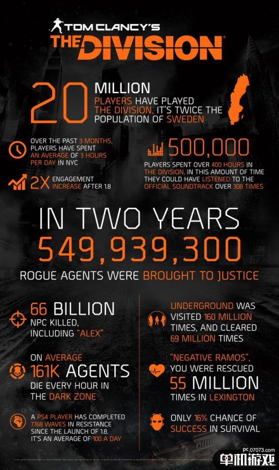 在過(guò)去三個(gè)月時(shí)間內(nèi),《全境封鎖》玩家平均每天要在末世紐約里花費(fèi)3個(gè)小時(shí),大約有20萬(wàn)玩家在游戲中花費(fèi)了超過(guò)400小時(shí),這意味他們已經(jīng)聽(tīng)了OST超過(guò)308遍。兩年內(nèi),有大約5.5億反叛特工被正義制裁。660億個(gè)NPC被突突了,當(dāng)然也包括叫Alex的,“地下世界”被拜訪(fǎng)了1.6億次,打穿6900萬(wàn)次,平均每小時(shí)有16.1萬(wàn)名特工在暗區(qū)被干掉,Ramos被解救了5500萬(wàn)次,生存模式只有16%的成功率。