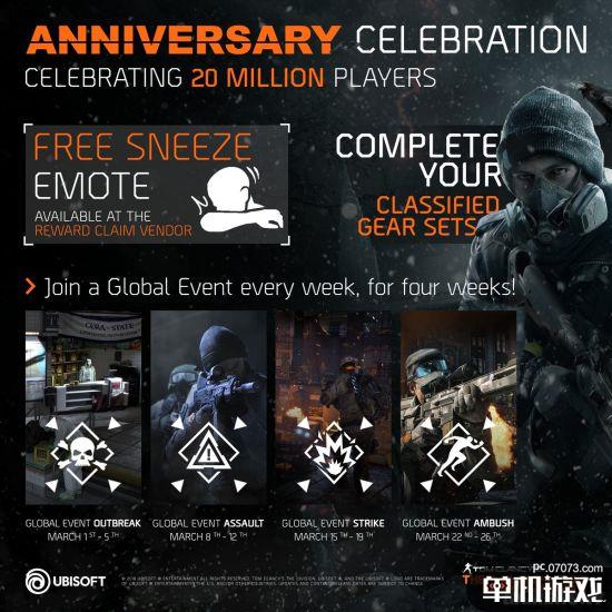 為了慶祝兩周年的到來(lái),育碧也將舉辦游戲內(nèi)的慶?;顒?dòng),此前的四次活動(dòng)時(shí)間都會(huì)回歸,玩家可以補(bǔ)完之前錯(cuò)過(guò)的裝備和成就,慶典期間登陸游戲就可以免費(fèi)領(lǐng)取“打噴嚏”表情動(dòng)作,在Twitch上看直播還可以解鎖游戲內(nèi)獎(jiǎng)勵(lì)。