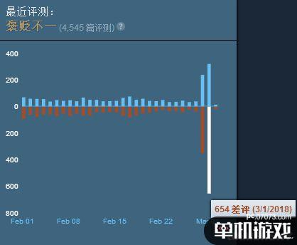 從Steam的玩家評(píng)測來看,系統(tǒng)檢測到從2月28日~3月2日,也就是《H1Z1》正式發(fā)行后,突然涌現(xiàn)了大量的玩家評(píng)測,雖然好評(píng)數(shù)也有所增加,但差評(píng)增長的更加明顯,只3月1號(hào)單日就有654個(gè)差評(píng)。