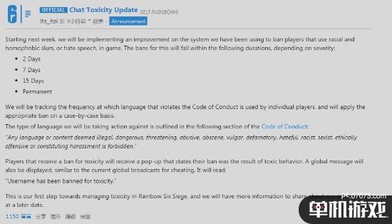 育碧官方表示,官方一直在使用一套系統(tǒng),對在游戲中發(fā)表種族、同性戀仇視/詆毀言論的玩家予以封禁,在下周官方將對這套系統(tǒng)進行升級。違反用戶行為準則的玩家將受到2天/7天/15天乃至永久封禁不等的處罰。