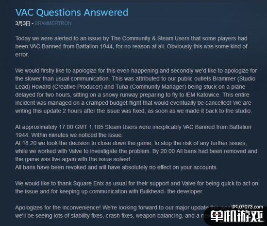 所幸,針對(duì)這種情況,《軍團(tuán)1944》官方已經(jīng)發(fā)布公告,稱他們注意到了這一問題,并對(duì)于此事向玩家道歉。截止到昨日20:00,所有的禁令已經(jīng)被移除,還承諾對(duì)玩家的賬戶絕對(duì)沒有影響。此外,本周他們還將迎來重大更新,將會(huì)有許多穩(wěn)定性修復(fù)、崩潰修復(fù)、武器平衡和新地圖等內(nèi)容到來。