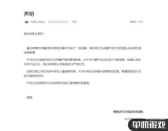 剛剛,PUBG_STEAM在微博上就近期某職員事件引起的話題發(fā)布了聲明,表示正在進(jìn)行內(nèi)部調(diào)查。