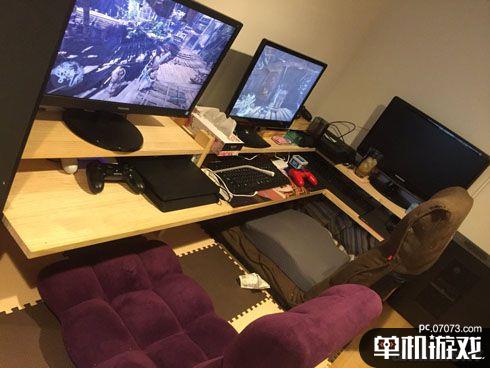 因為妻子說“想要在你旁邊玩游戲”,島國的一位丈夫搭建了一個溫馨的雙人游戲室滿足了她的愿望。兩個舒適的座位緊靠,放置著三臺顯示器,有PC,有PS4,手柄也是一紅一黑,屬于二人的游戲室就這樣誕生了。