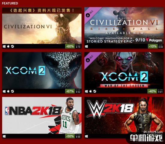 Steam迎來了2K發(fā)行商周末特惠,2K旗下各類大作紛紛打折,《文明6》4折僅需79元,《NBA2K18》五折僅需99元,《四海兄弟3》33折只需43元。