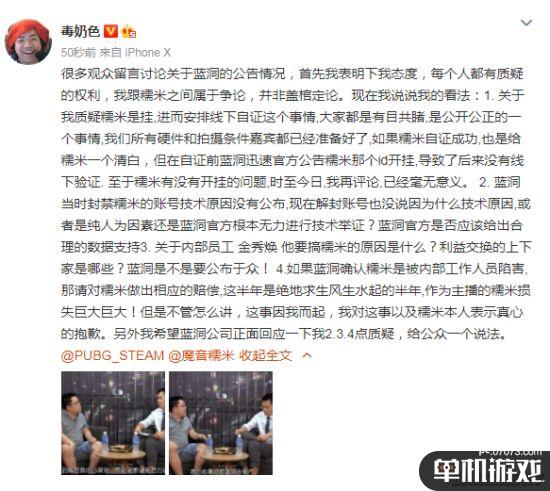 “1. 關(guān)于我質(zhì)疑糯米是掛,進而安排線下自證這個事情,大家都是有目共睹,是公開公正的一個事情,我們所有硬件和拍攝條件嘉賓都已經(jīng)準備好了,如果糯米自證成功,也是給糯米一個清白,但在自證前藍洞迅速官方公告糯米那個id開掛,導(dǎo)致了后來沒有線下驗證. 至于糯米有沒有開掛的問題,時至今日,我再評論,已經(jīng)毫無意義。