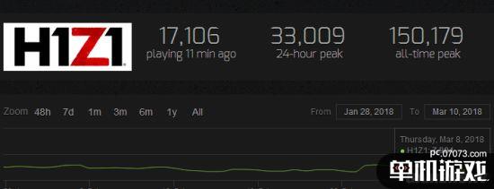 根據(jù)Steamcharts的統(tǒng)計顯示,過去24小時內,《H1Z1》在線玩家數(shù)峰值達到了33009,3月9號的在線玩家最高值也有32703人,這一數(shù)字同免費前相比,有了大幅增長,要知道3月8日的巔峰人數(shù)也才為7984人,現(xiàn)如今漲了4倍還要多,這也創(chuàng)下了自今年1月以來的最高在線數(shù)值。